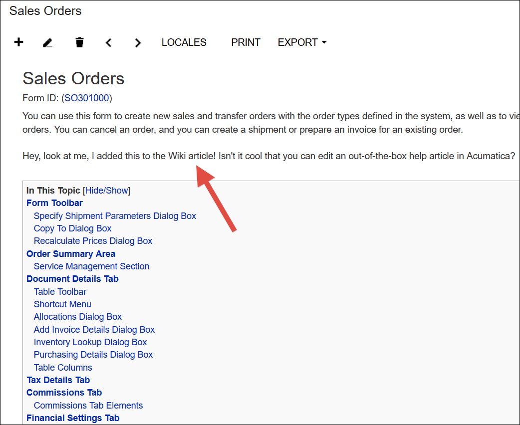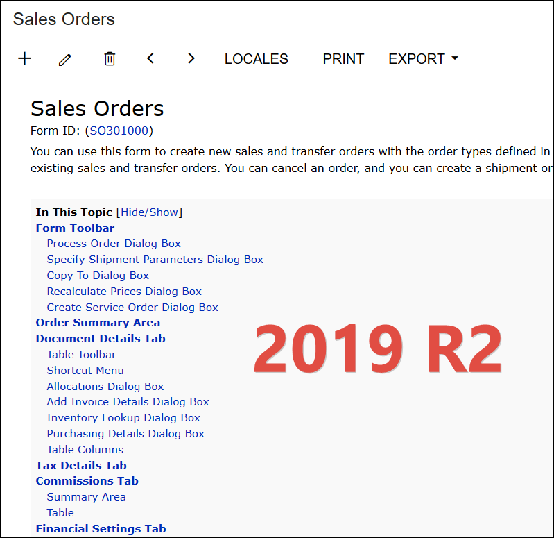 1. Checked the Wiki Help article for the Sales Orders (SO301000) screen in a 2019 R2 environment and noted that it looks like this: