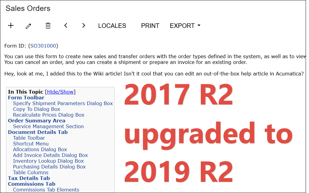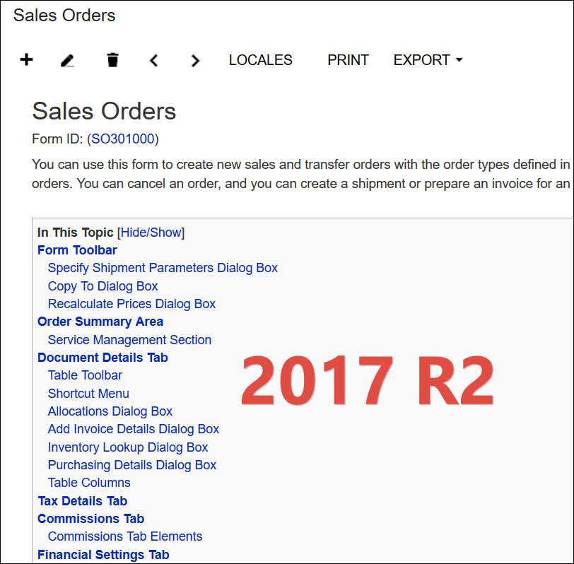 2. Checked the Wiki Help article for the Sales Orders (SO301000) screen in a 2017 R2 environment and noted that it looks like this: