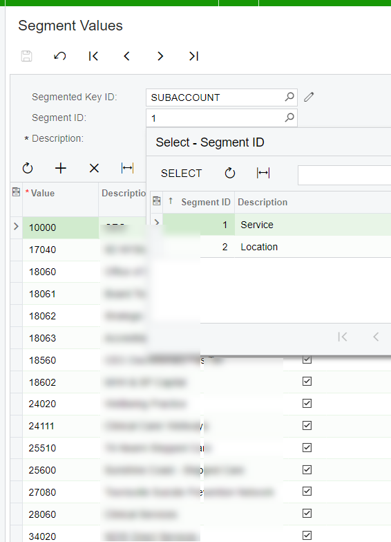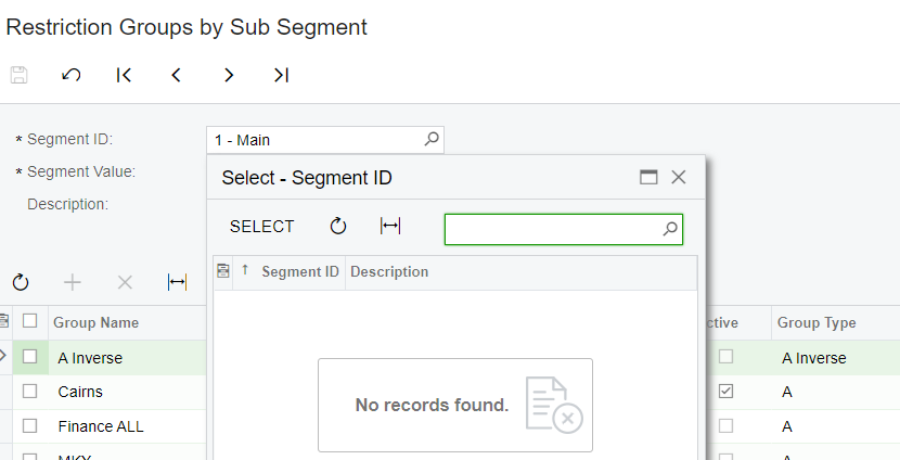 another thing I cannot figure out why is showing this value is when I go to screen GL104040 restriction group by subsegment it shows segment ID 1- main which is not my subaccount segment I should be able to select 1 or 2 but none are showing here !