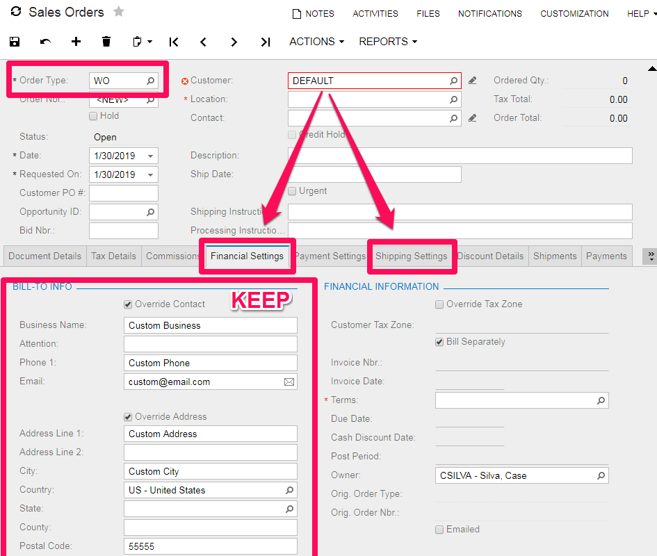 2) I understand why you are entering an order before the customer record is created in Acumatica. However, aren't you entering the same financial and shipping settings in the customer record when it is created? If so, how is the update causing an issue?
