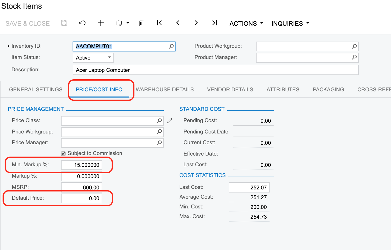Now, you would set the default price of the item to zero (this is critical as described below) and then specify a min markup of 15%. You may also want to set the markup % to the 15% as well so Acumatica can perform the gross margin validation without giving you a warning since it cannot calucate from zero:
