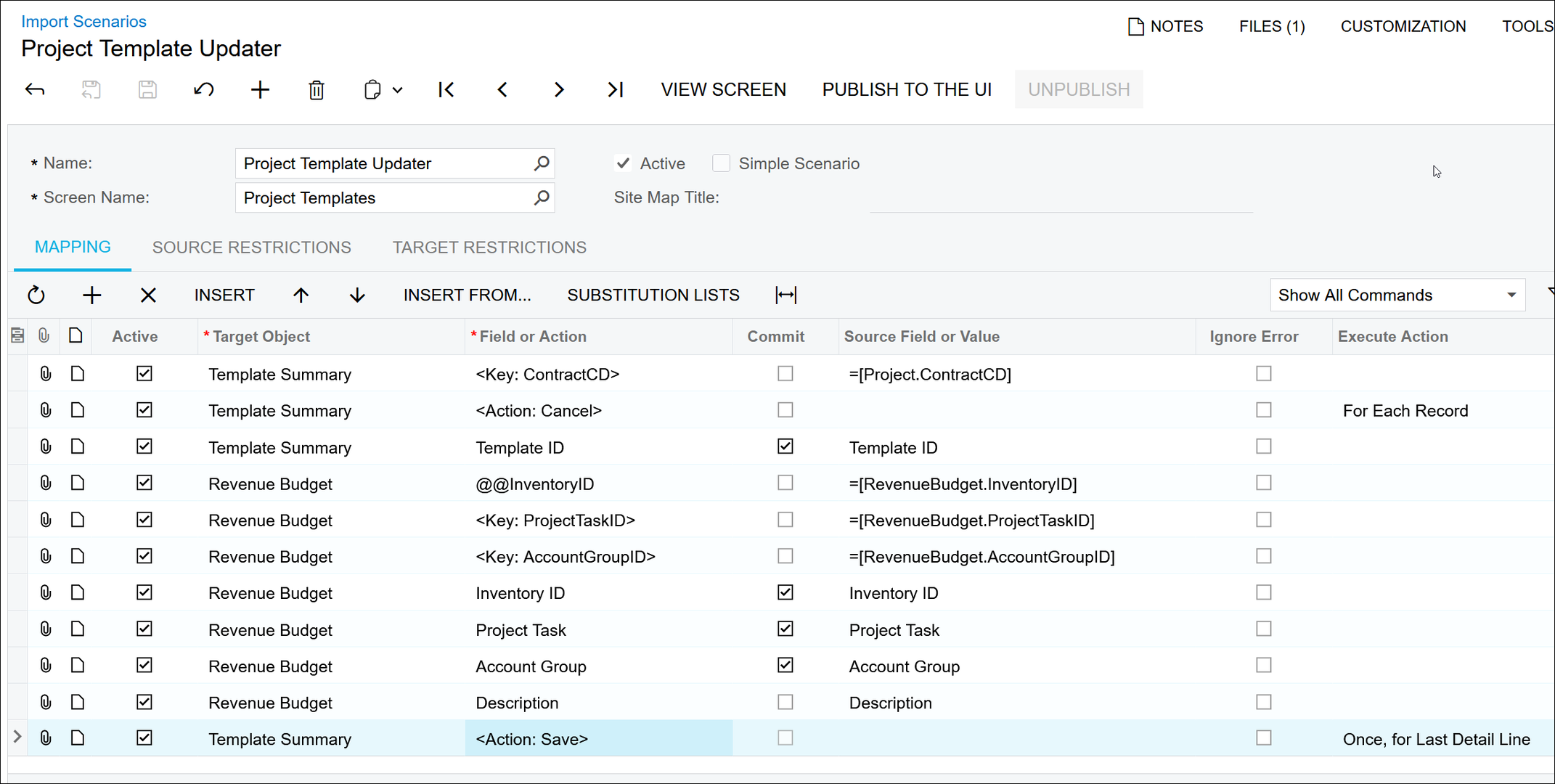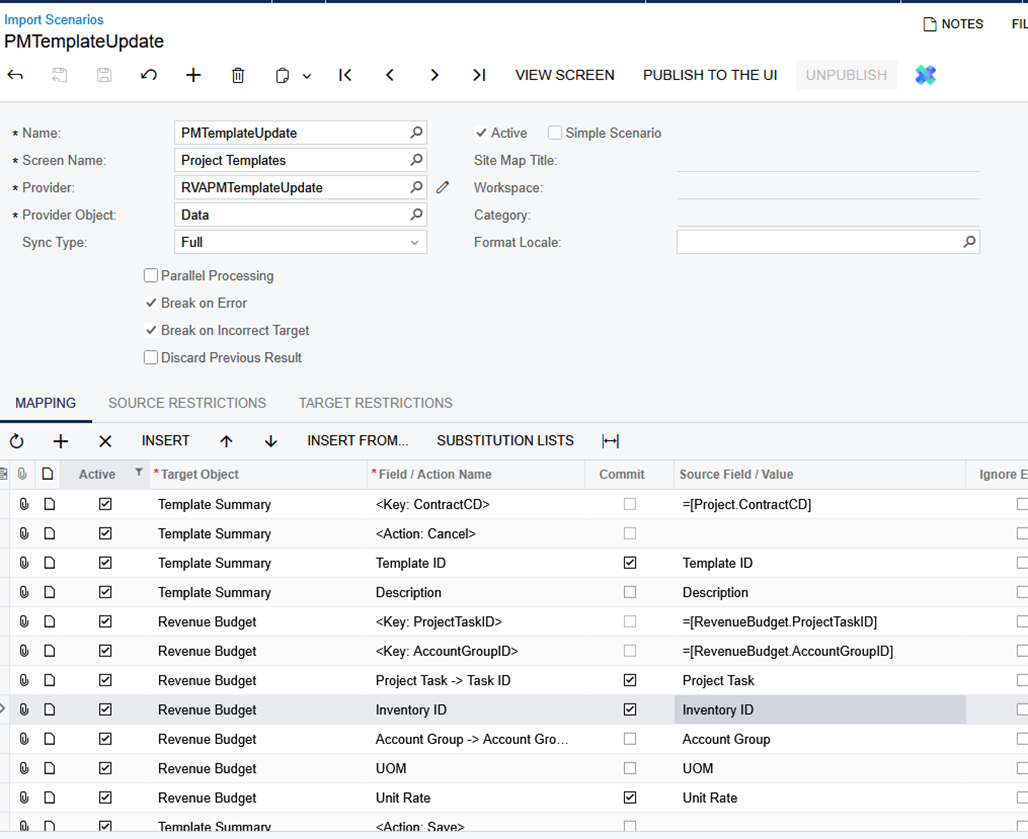And here's what the Project Templates (PM208000) screen looked like AFTER running the Import Scenario: