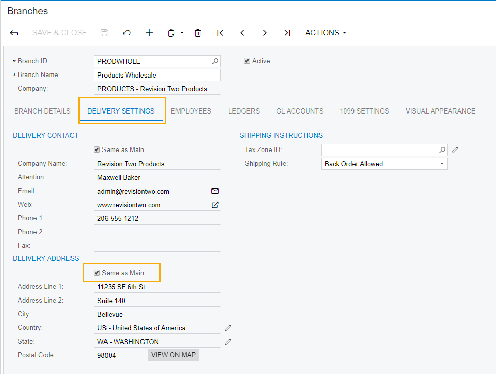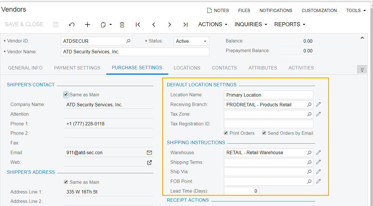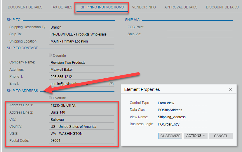 The other interesting thing I noticed on the Shipping Instruction tab of the PO is that if you leave it as the Branch, there seems to be an option to pick different locations for that branch (same as how you can have multiple locations for your customers or vendors), but I haven't been able to find where you set those up in Acumatica (as there's no Locations tab on the Branch or Companies pages and it's not picking up the locations from the field services screens in the standard demo data).